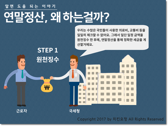 쉽게 말하면 근로자들이 신고를 잘 할 수 있을지 모르겠고, 세금 안 내고 도망가는 사람이 있을 수도 있으니, 미리 월급 줄 때마다 일정액을 떼고 준 다음 나중에 정확히 계산해서 더 걷었으면 돌려주고 덜 걷었으면 그만큼 더 떼는 것이다.